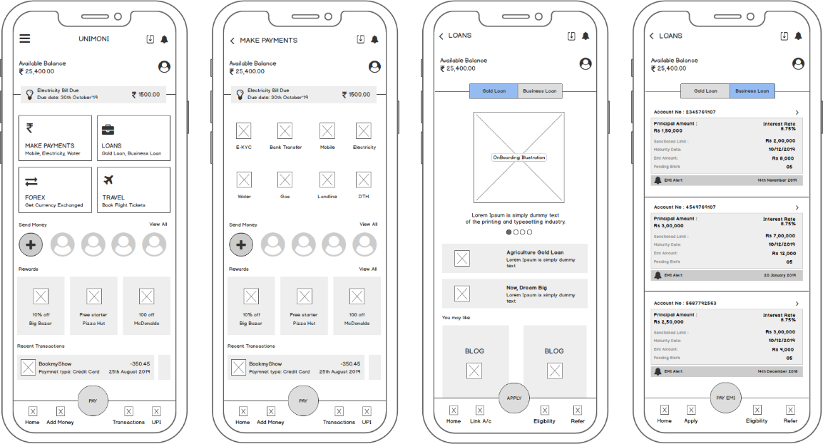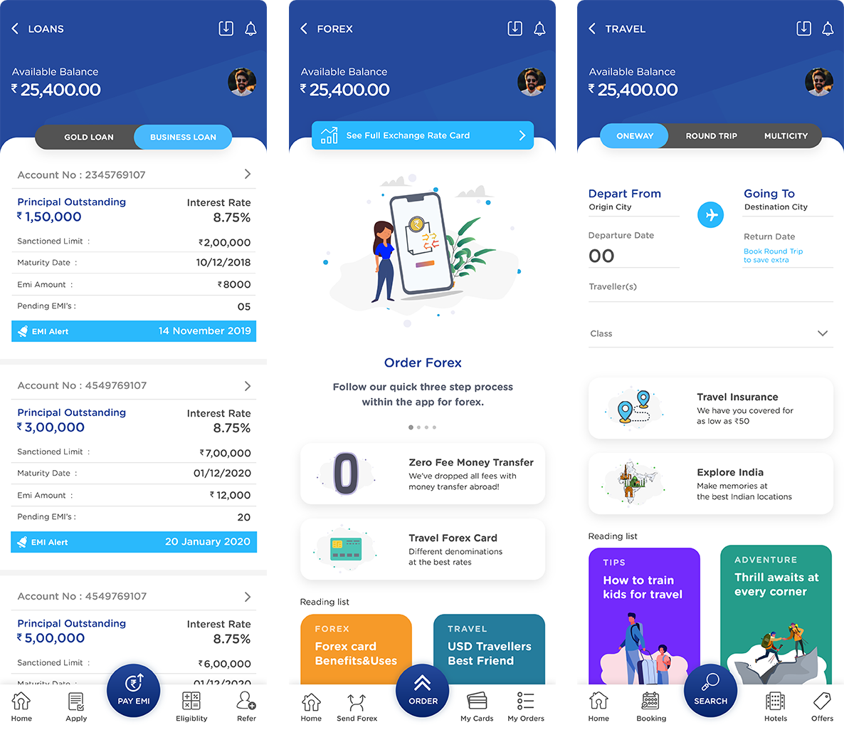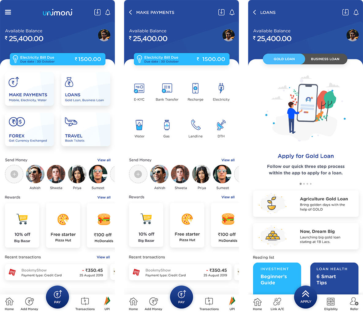 All the apps are very well established in the market and have a very large amount of user base. The requirement was to have instant money transfer to any bank account, apply for gold/business loans, view loan status, one-stop solution for all your bill payments, and flight ticket booking.